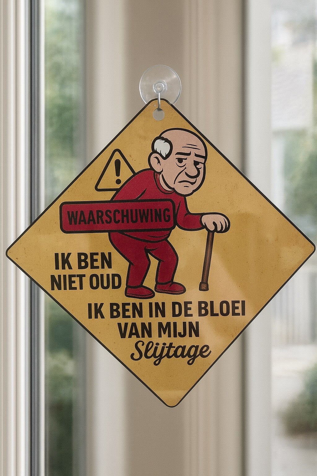 Waarschuwingsbord ‘Ik ben niet oud, ik ben in de bloei van mijn slijtage’